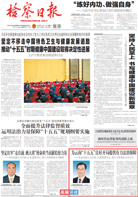 3月7日,《检察日报》头版刊发文章《为云南“十五五”良好开局提供有力法治保障——专访全国人大代表,云南省委书记、省人大常委会主任王宁》。