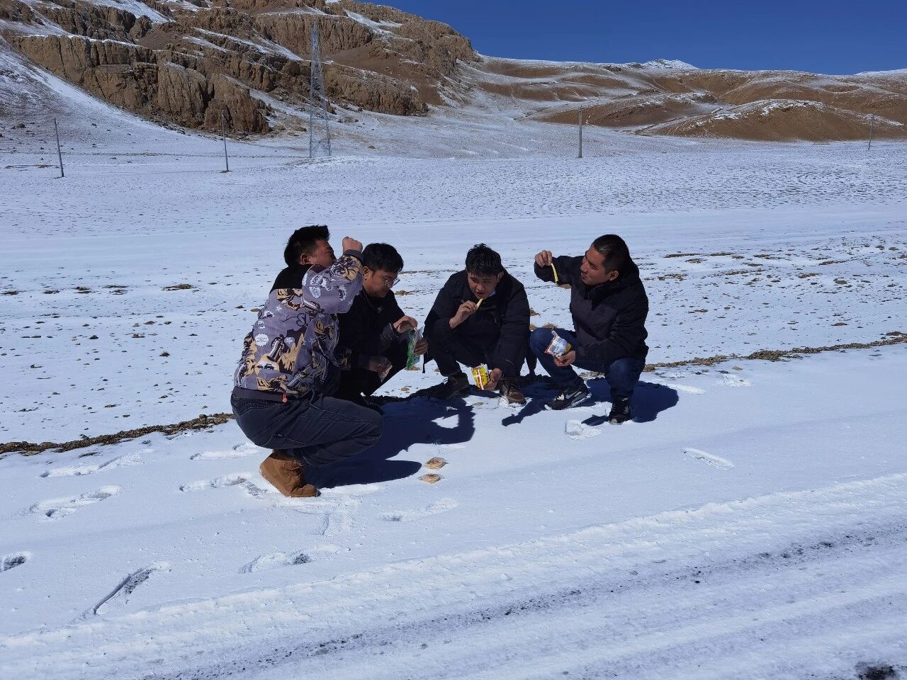 有一次,为了执行任务,民警们在边境线的乱石堆里蹲守。渴了,化雪水;饿了,啃硬干粮。