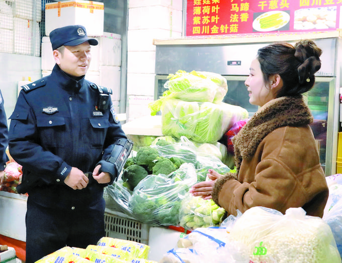 2月11日,汉城派出所民警在新北城农副产品批发市场走访商户,了解商户所需。王淼仙摄