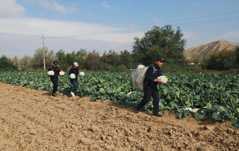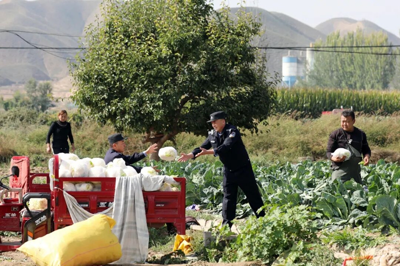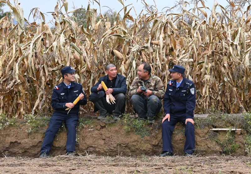 ▲近日,甘肃省兰州市皋兰县公安局三川口派出所民辅警在田间地头,用实际行动为秋收保驾护航。(杨钊 摄)