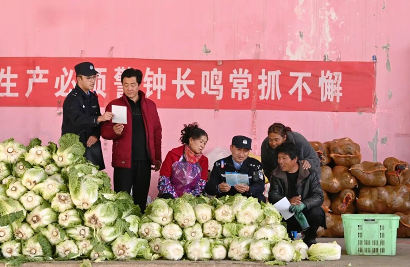 ▲近日,甘肃省兰州市榆中县公安局高崖派出所民辅警在田间地头、蔬菜保鲜库开展反电信网络诈骗与交通安全知识宣传。(张军扬 摄)