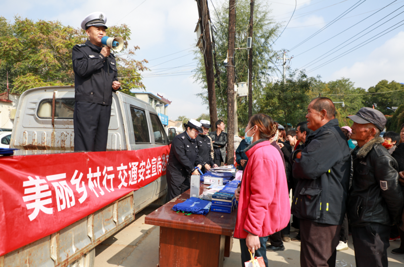 ▲近日,甘肃省兰州市公安局交管支队安宁大队走进九合镇农村集市,开展“美丽乡村行”交通安全宣传活动。(朱秦祖 摄)