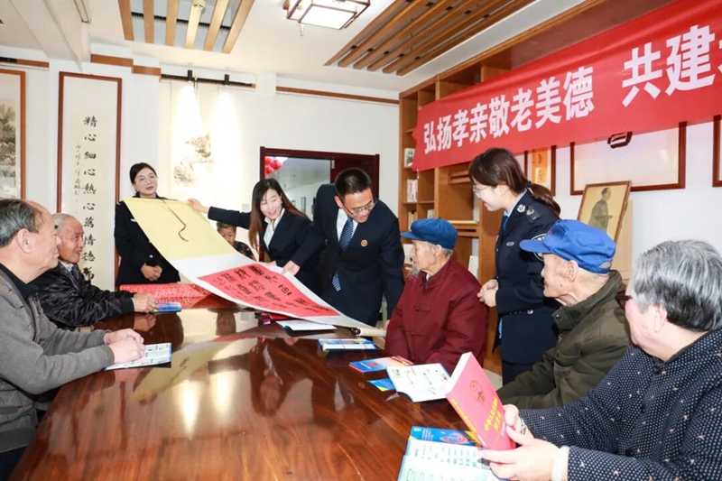 活动现场,公证人员围绕遗嘱、赡养、意定监护及防范诈骗等老年人关切的法律问题,用通俗易懂的乡语乡音,结合案例耐心讲解,引导他们运用法律工具守护自身权益。“原来觉得公证又远又难,今天一听全明白了!”一位82岁老人拉着工作人员的手说,“特别是遗嘱公证,让我晓得怎么按自己的心意安排身后事,不给儿女添麻烦,心里一下就踏实了。”活动还向老人们发放了《中华人民共和国民法典》《中华人民共和国老年人权益保障法》等法律读本和宣传册,并送上寓意吉祥的书画作品,让法律知识伴随墨香融入老人们的日常生活。
