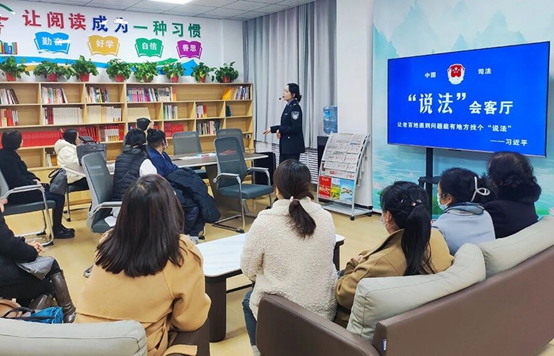 庆城县综治中心“说法”会客厅给前来办事的群众普法。(资料图)
