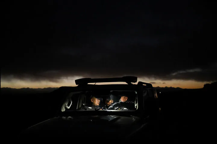 1月8日,在青海省门源县境内的老虎沟,民警和生态管护员在进行巡护。