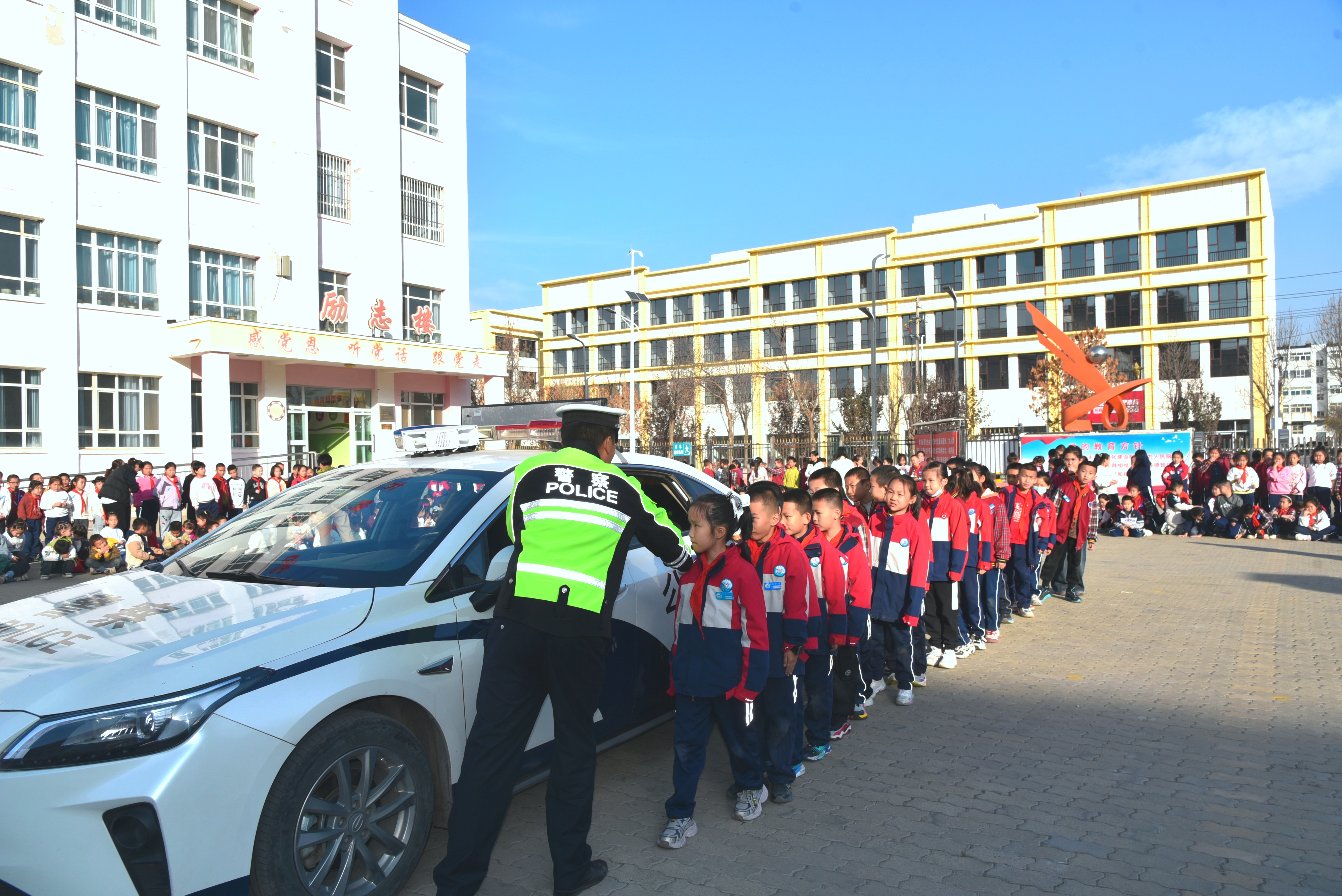 图为交警和同学们合影。马燕摄