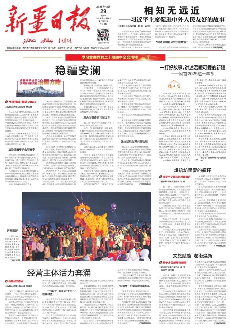 2025年,新疆牢牢扭住社会稳定和长治久安总目标,交出了“边疆稳、社会安、经济兴、人心聚”的时代答卷,这既是新时代党的治疆方略的成功实践,更为边疆治理写下生动注脚。