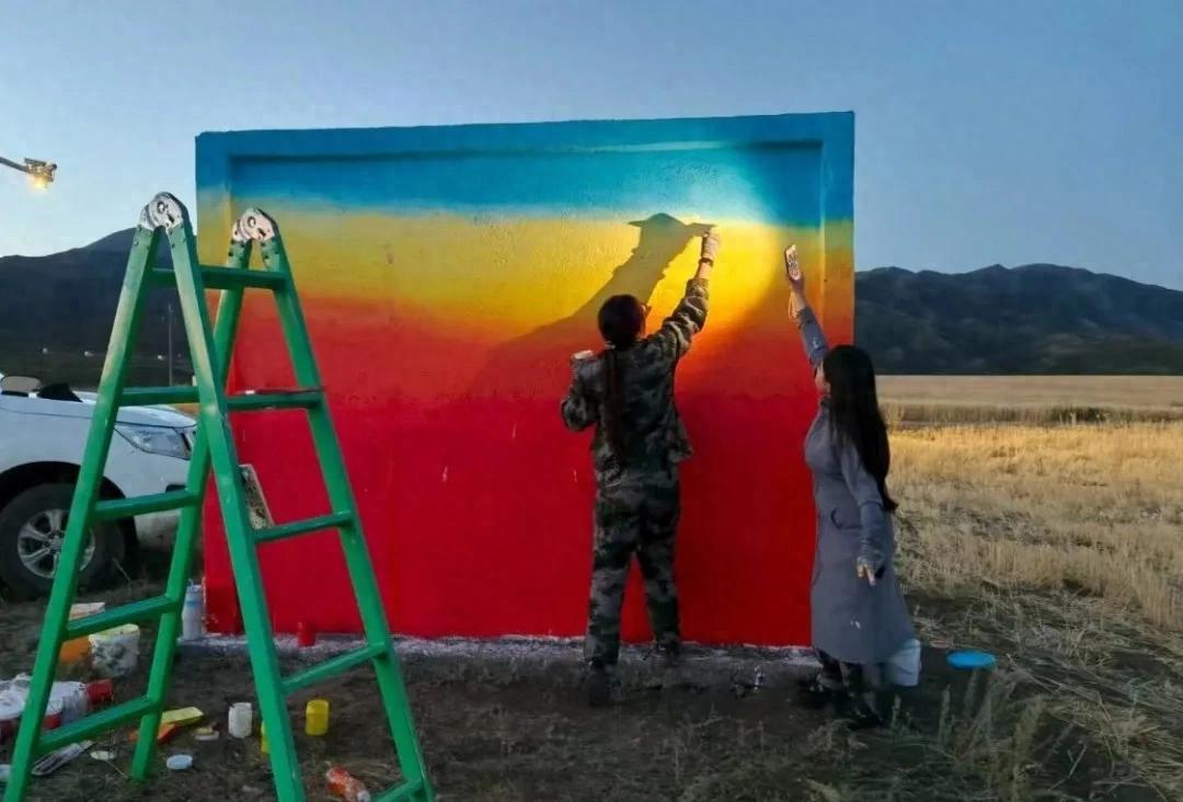 自今年五月起,这两位姑娘便自发奔走于边境线的每一个角落。166团的警务站、执勤房……她们脚步所至,皆成为戍边文化的画布。从印刻岁月痕迹的警务站外墙,到见证无数巡边归途的执勤房墙壁,每一个留有护边记忆的地方,都变成她们灵感的源泉。