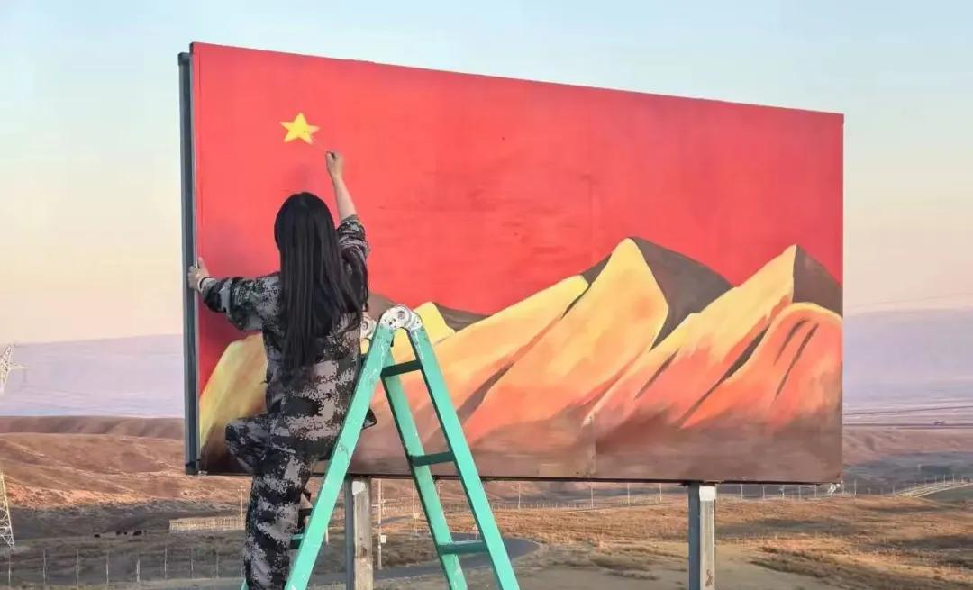 执勤房外,师晓雪正专注握着刷子给五星红旗绘制底色,红色颜料顺着刷子边缘缓缓流淌,在阳光下泛着柔和的光,那抹鲜红与执勤房外的蓝天相映,格外耀眼。