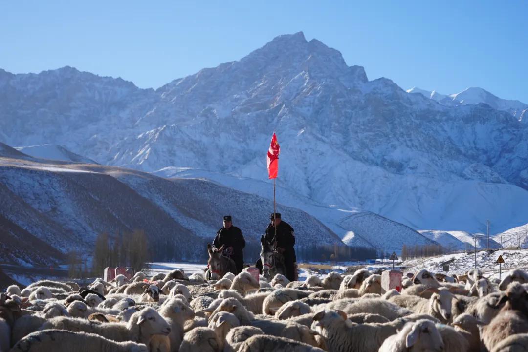 11月8日,初冬已至,新疆生产建设兵团第十四师昆玉市一牧场迎来羊群冬季转场,和田垦区公安局昆牧派出所党员突击队踏雪护航,以实际行动推行“四赢”工作法,生动诠释了警民情深。