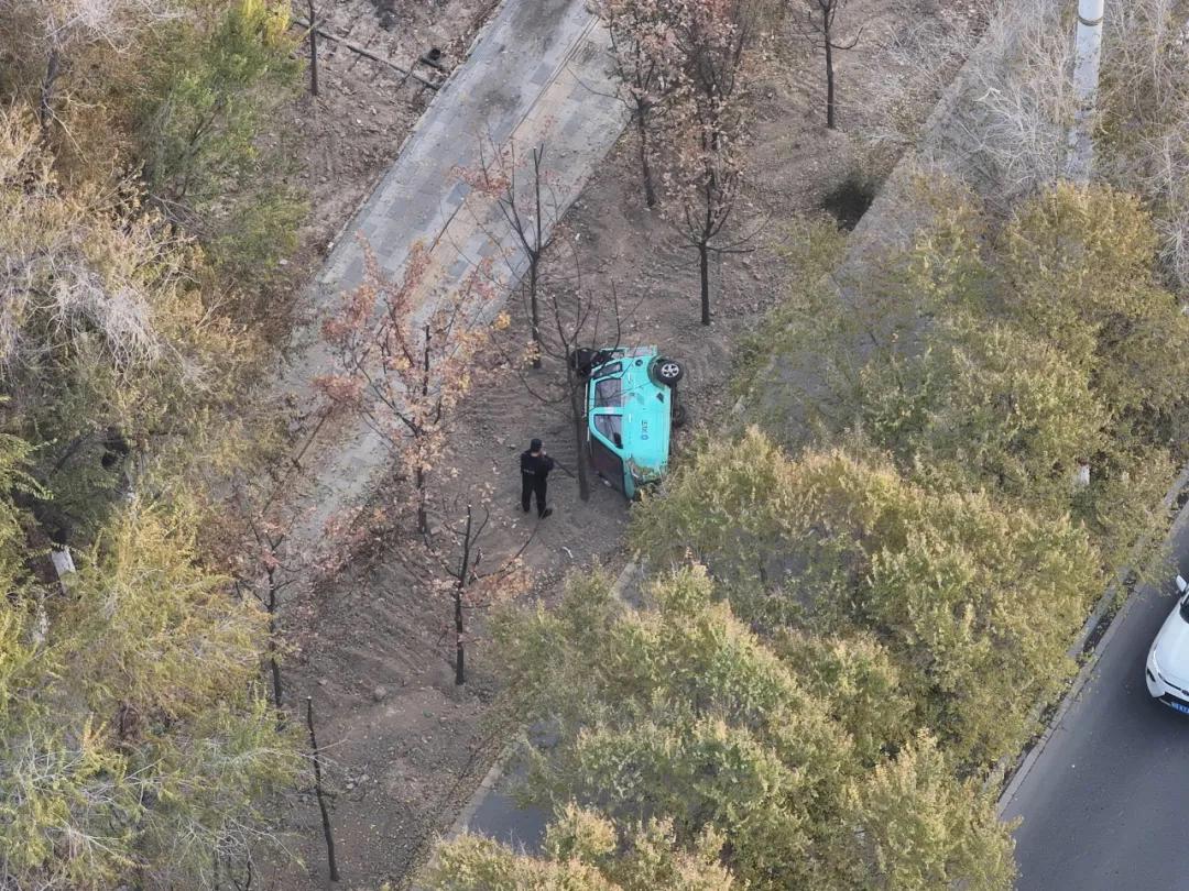 近日,伊犁路派出所中心警务站民警操控无人机日常巡视时,在辖区树林带上空发现一辆侧翻电动三轮车。操作员确认异常后即刻通报街面巡逻组,民辅警迅速抵达现场。
