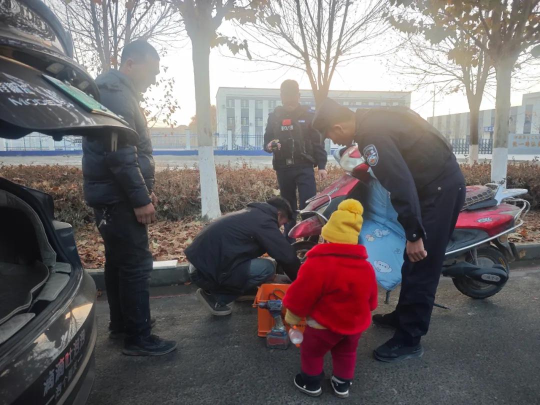 就在轮胎充气的间隙,孩子突然挣脱母亲的怀抱,在民辅警之间来回观察,最后停留在辅警刘文文身边。他看着忙碌的警察叔叔没有理自己,让妈妈又把自己抱了起来。