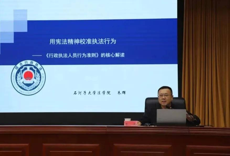 12月2日,第七师胡杨河市举办“宪法进机关”专题活动,特邀石河子大学法学院教授朱辉作专题讲座。朱辉以“用宪法精神校准执法行为——《行政执法人员行为准则》核心解读”为题,从设立国家宪法日的意义切入,强调“宪法应镌刻在每个公民心中”,还结合行政执法实际,对《行政执法人员行为准则》中“十个严禁”的内容进行逐条解读,引导执法人员自觉以宪法为遵循,规范执法行为、坚守法律底线。