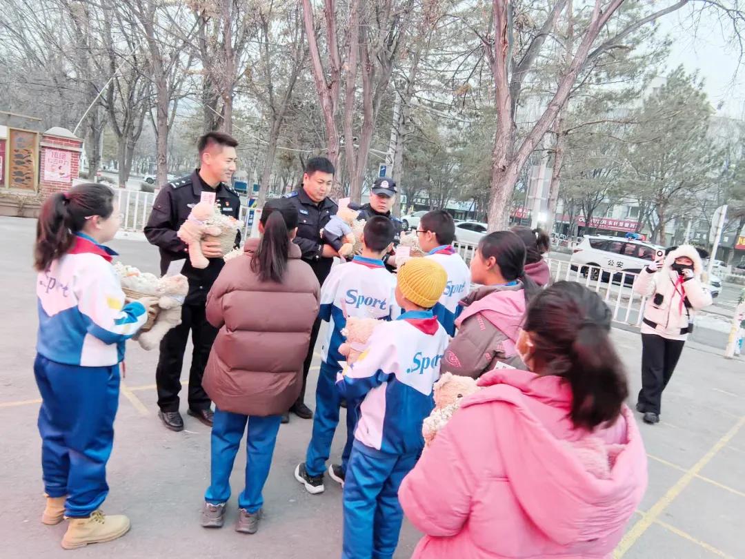 活动接近尾声,民辅警代表与师生们一起合影留念。照片中,民辅警们一手捧着花篮,一手抱着小熊,脸上洋溢着腼腆而幸福的笑容;孩子们围在旁边,像一群欢快的小鸟,脸上写满了安心与喜悦。这一和谐的画面,被永远定格在了这个冬日的清晨,成为了警民之间美好情谊的见证。