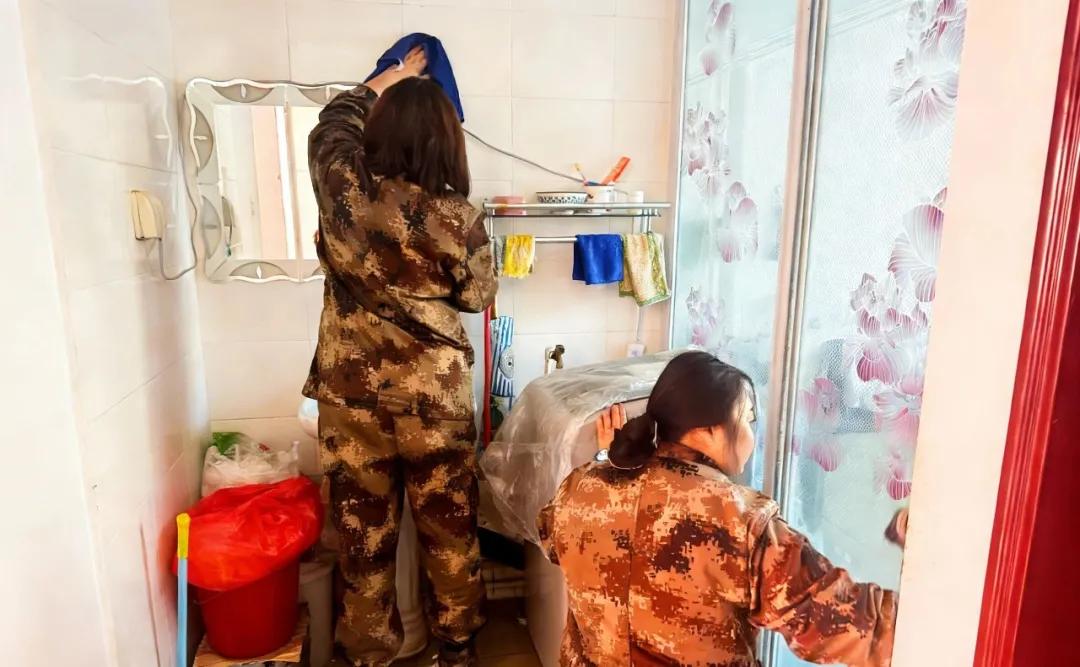 闲聊片刻,几人拿起抹布便忙了起来,利落地擦拭家具、门窗,清扫整理房间。看着床上散乱的被褥,几人又麻利地将被子叠得方方正正,棱角分明如军营里的标准模样。
