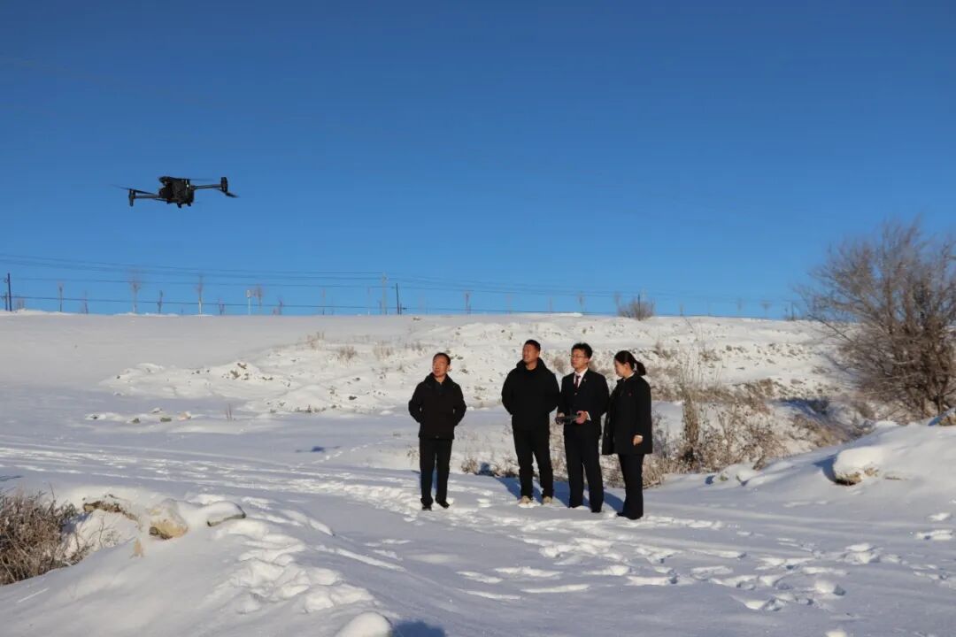尽管河道已被冰雪覆盖,巡河组的工作却并未停歇。此次巡河采用“现场查看+无人机航拍”相结合的方式,确保监管无死角、无盲区。巡河组沿河而行,重点查看河道两岸是否存在非法采砂留下的痕迹、是否有生活垃圾或建筑垃圾违规倾倒、河岸设施是否完好。
