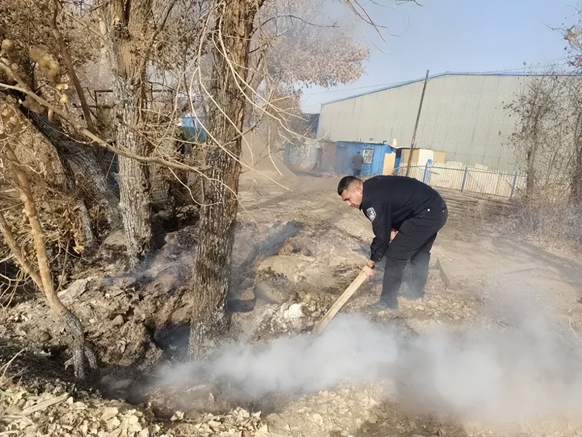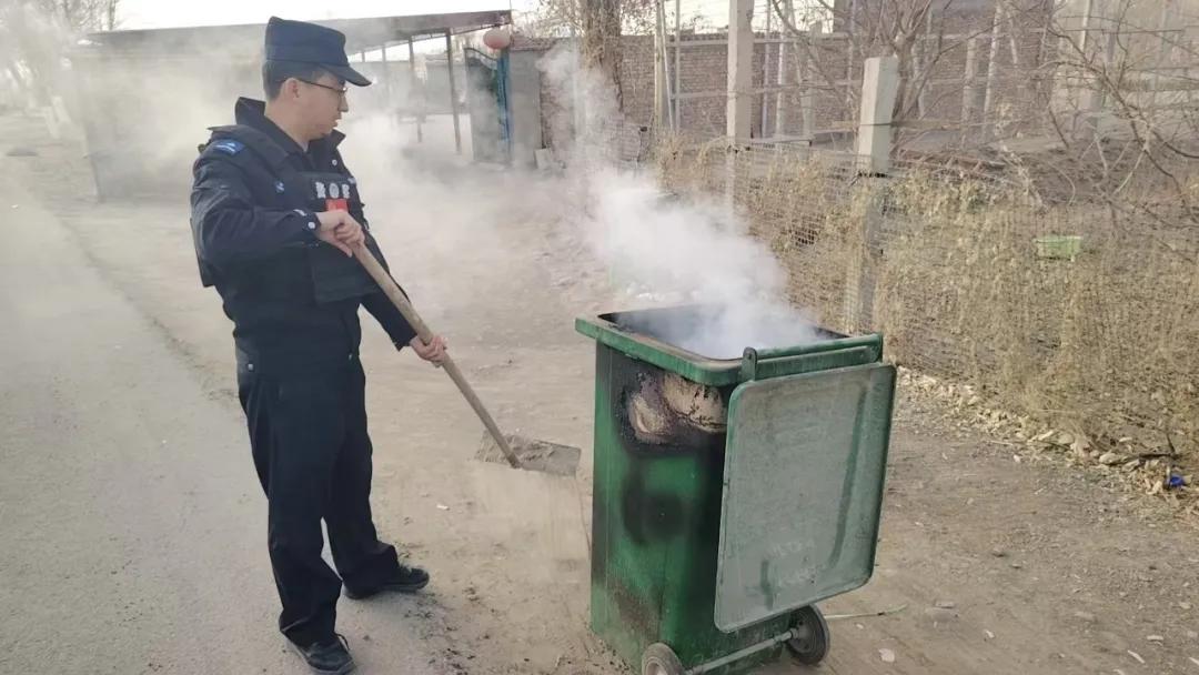 1月26日清晨,在托喀依乡路边一角,一个绿色垃圾桶正冒出浓烟。走访的警务室民警忙从附近居民家中借来铁铲,上前铲土覆盖,处理掉未尽的火苗。