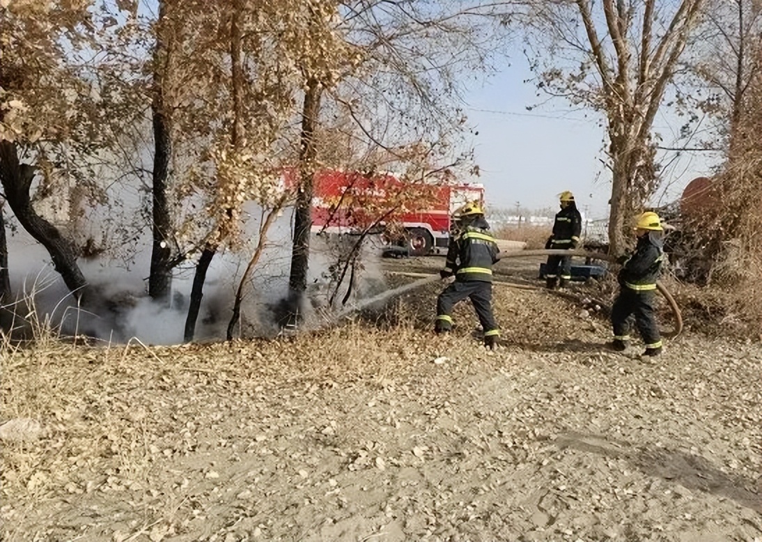 1月26日中午,阿拉尔火车站派出所接到报警,创业园南侧树林带着火。火场植被茂密,距铁路线仅百米,风助火势,威胁极大。民警立即启动预案,上报、求援、划定警戒区。
