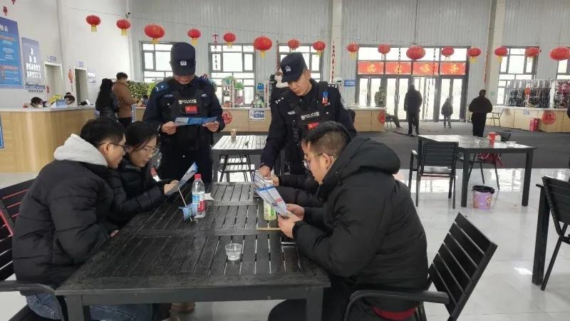春节期间,兵团第三师图木舒克垦区公安局海安派出所永安湖景区警务室民辅警在永安湖生态旅游区给游客进行安全提示。受访单位供图