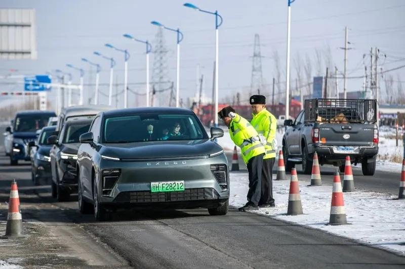春节期间,兵团第十师北屯市公安局交管支队交警引导司机有序通行。受访单位供图