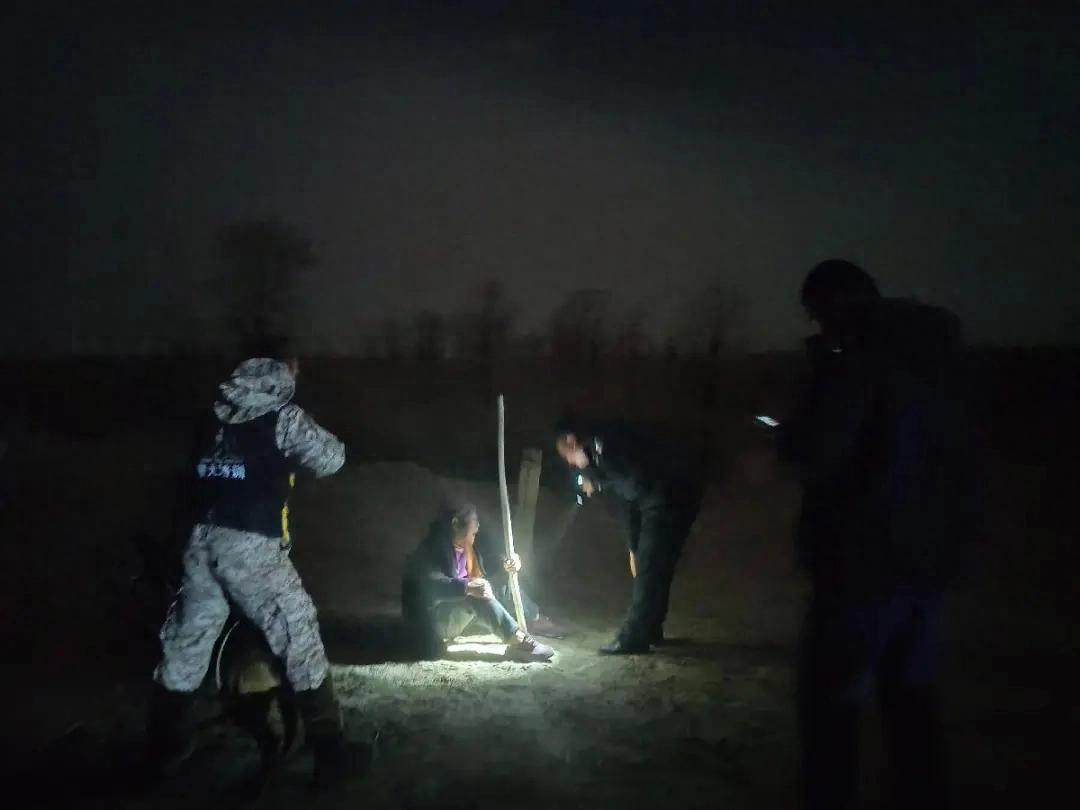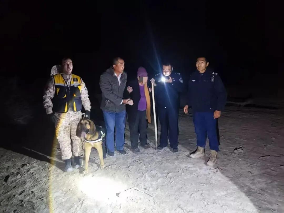 “同志们,警犬已经找到老人的线索了,应该就在附近!”话音刚落,果然就在前方不远处的一棵胡杨树下,民辅警的手电筒照到了一个疲惫的身影,正是大家苦苦寻找了12小时的,冯女士走失的母亲。