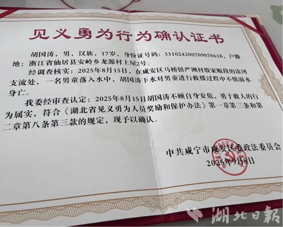 9月8日,湖北省咸宁市咸安区委政法委召开见义勇为通报表扬会,将见义勇为行为确认证书郑重交到胡国涛家...