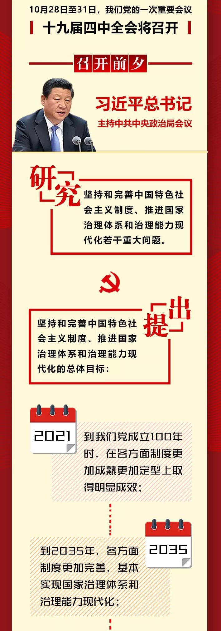 中国共产党第十九届中央委员会第四次全体会议28日上午在京召开。中央委员会总书记习近平代表中央政治局向全会作工作报告,并就《中共中央关于坚持和完善中国特色社会主义制度、推进国家治理体系和治理能力现代化若干重大问题的决定(讨论稿)》向全会作了说明。